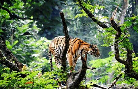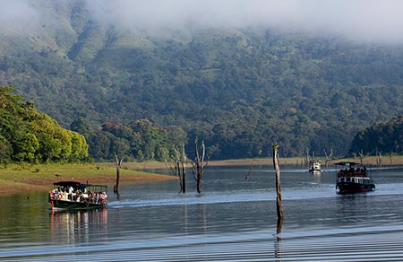 Thekkady is located about 257 km (160 mi) from Trivandrum, 140 km from Madurai City and Madurai Airport, 145 km from Cochin International Airport and 114 km from Kottayam railway station. Thekkady is located near to Kerala-Tamil Nadu border. The sanctuary is famous for its dense evergreen, semi-evergreen, moist deciduous forests and savanna grass lands. It is home to herds of elephants, sambar, tigers, gaur, lion-tailed macaques and Nilgiri langurs.